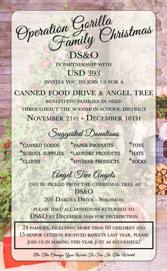 Mark your calendar for the best BBQ in Solomon! September is our Gorilla Backyard BBQ. We have 10 prospective teams and room for a few more to square off with last year's fierce rivals Riordans Road Kill and the Howard Brother's along with returning favorite FFA Flame Fanatics. We welcome newcomers Stein's Grillas and the Culinary Crusaders along with the Grillin Gorilla Foundation. If you want to have a team and cook up something fun, please contact Jodi Howard jhoward@usd393.net or 785-655-2541. for details. Anything goes, this is not just a BBQ competition. Student and adult teams are welcome.